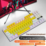 ChromaGlow 87-Key Mechanical Gaming Keyboard, a powerhouse designed for gaming enthusiasts. With a wired USB interface and a genuine mechanical shaft body, this keyboard ensures a responsive and tactile gaming experience. The two-color injection molding key cap is fade-resistant, guaranteeing durability and long-lasting vibrancy. Choose from 20 dynamic lighting modes to personalize your gaming setup. Engineered to resist splashes and water stains, this keyboard offers durability and peace of mind. Additionally, users can opt for either the green axis or the red axis, tailoring the typing experience to individual preferences. Elevate your gaming performance with the ChromaGlow Mechanical Gaming Keyboard, where precision meets customizable aesthetics.