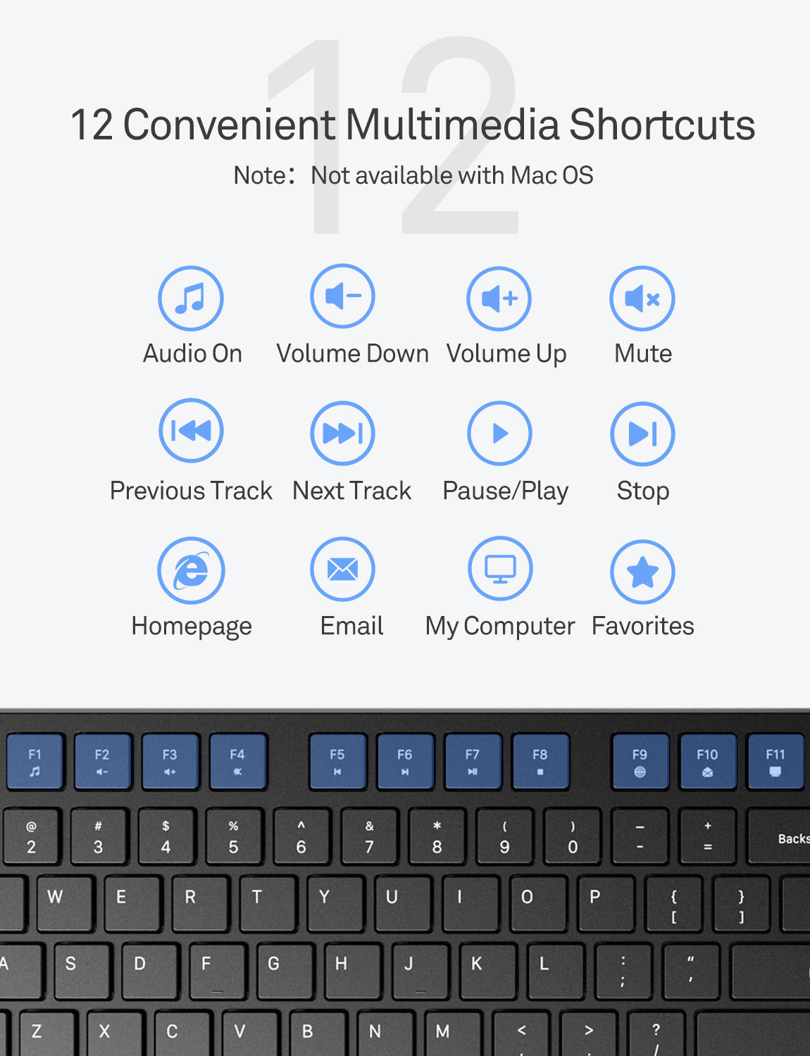 • MULTIFUCTIONAL. Boost your workflow with 12 multimedia keys & the 4-button mouse (800-1600 DPI). Slim portable design – easily tossed in your backpack. Convenient caps lock, num lock and battery power indicator lights are available for computing tasks.